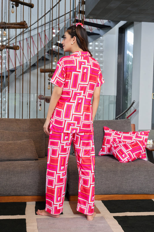 Trendy Geometric Print Nightwear – Pink PJ Set for Women