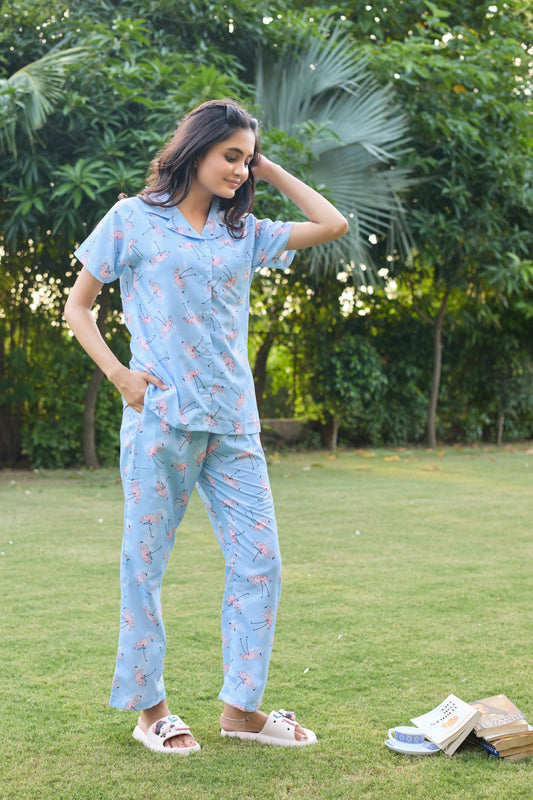 Light Blue Flamingo Print Women’s Nightwear PJ Set