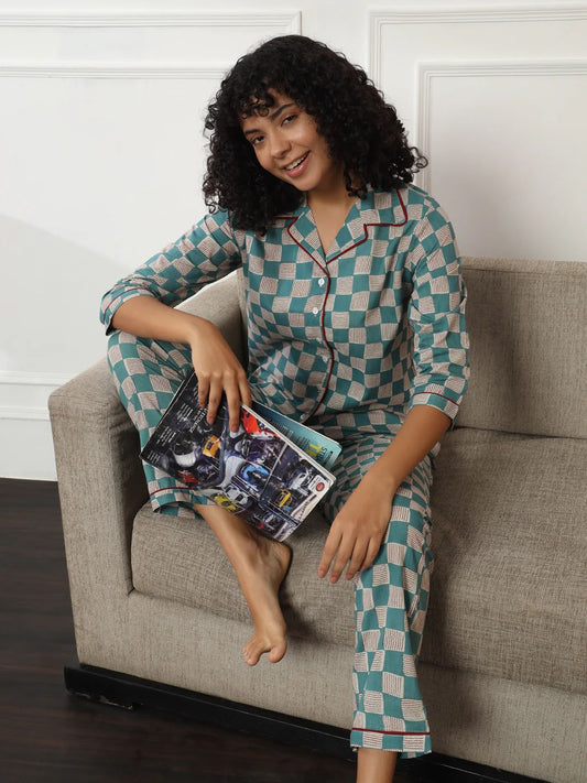 Women’s Nightwear Set in Bubble Fabric – Blue Checkered with Palm Print