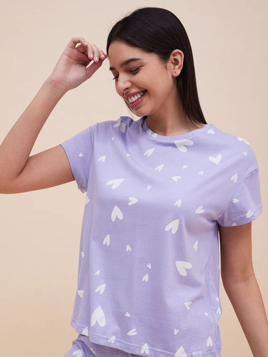 Purple cute Heart Printed Stylish Night Payjama-Set