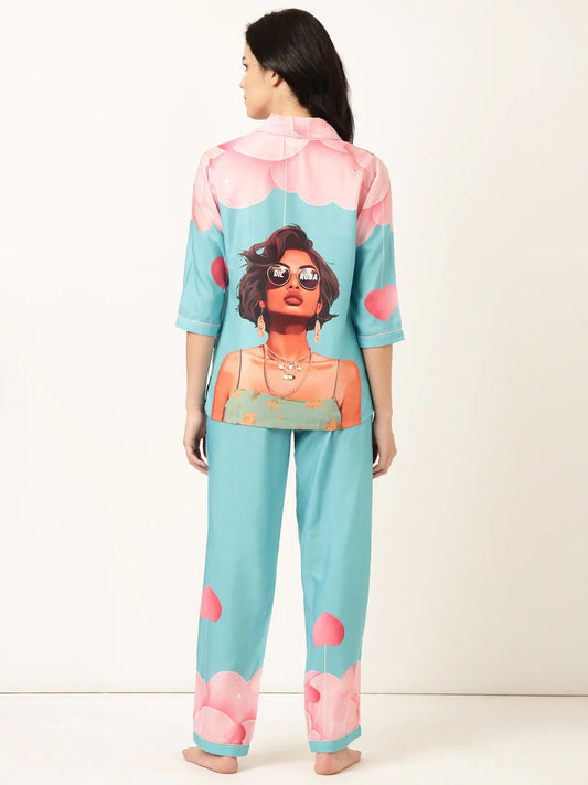 Swag Girl Back Printed Blue Pyjama Set | Womens pjs