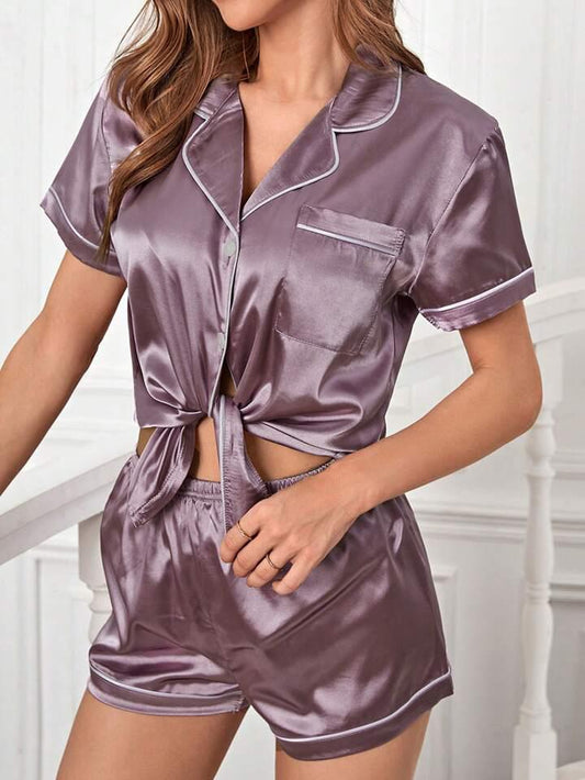Women's Satin Plain/Solid Relaxed Night Suit Set of Top & Shorts Set