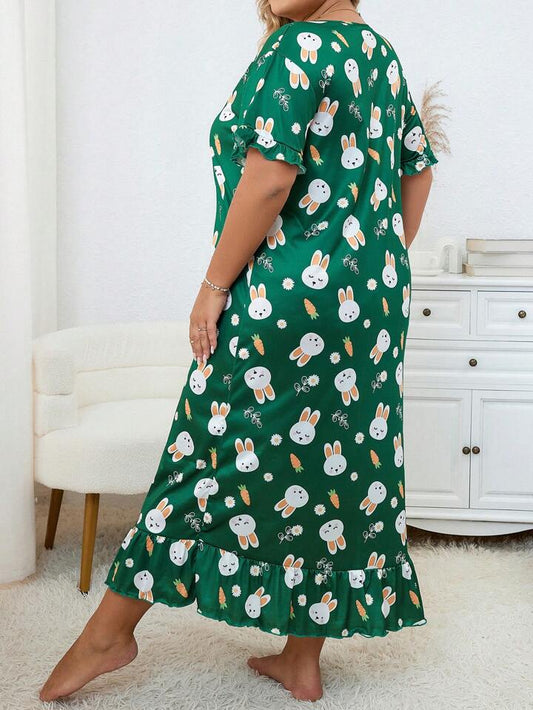 Plus Size Floral Green Rabbit Print Short Sleeve Crew Neck Ruffle Hem Sleep Dress