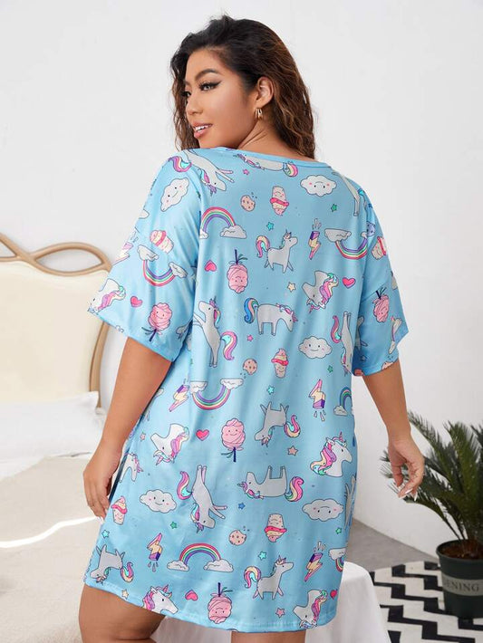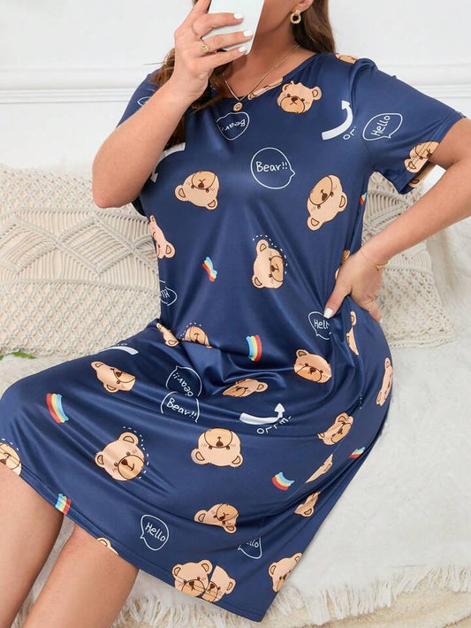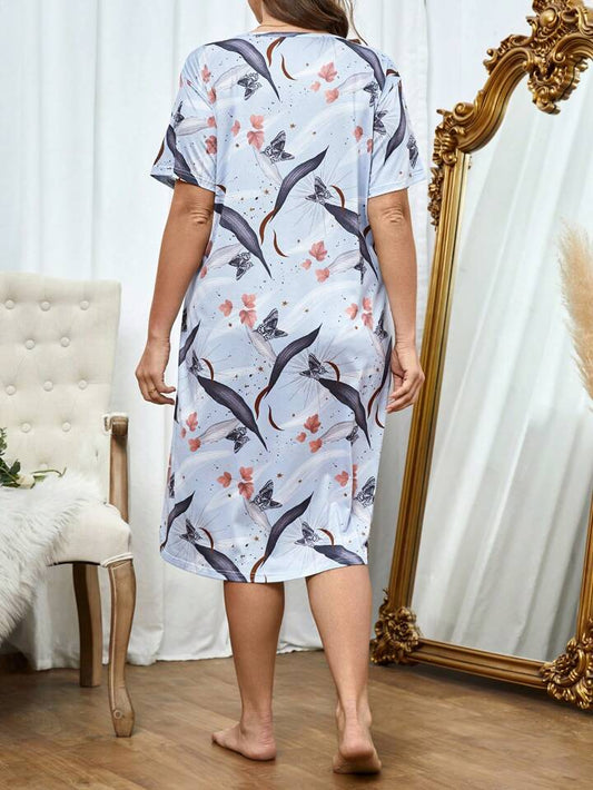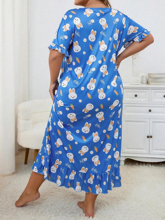 Plus Size Floral Blue Rabbit Print Short Sleeve Crew Neck Ruffle Hem Sleep Dress