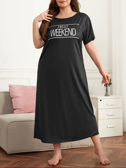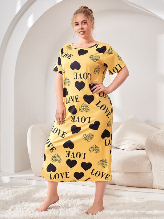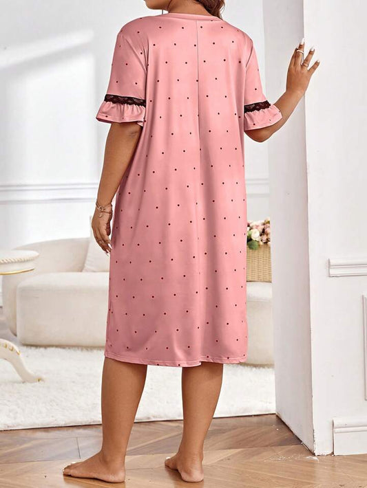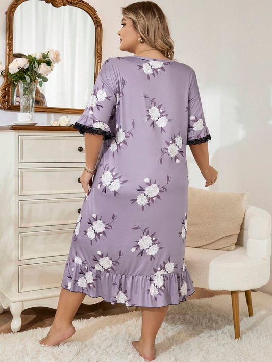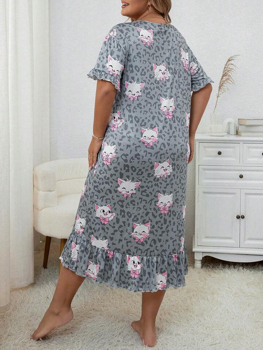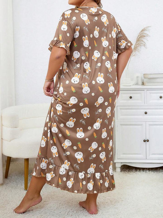 Plus Size Floral Rabbit Print Short Sleeve Crew Neck Ruffle Hem Sleep Dress