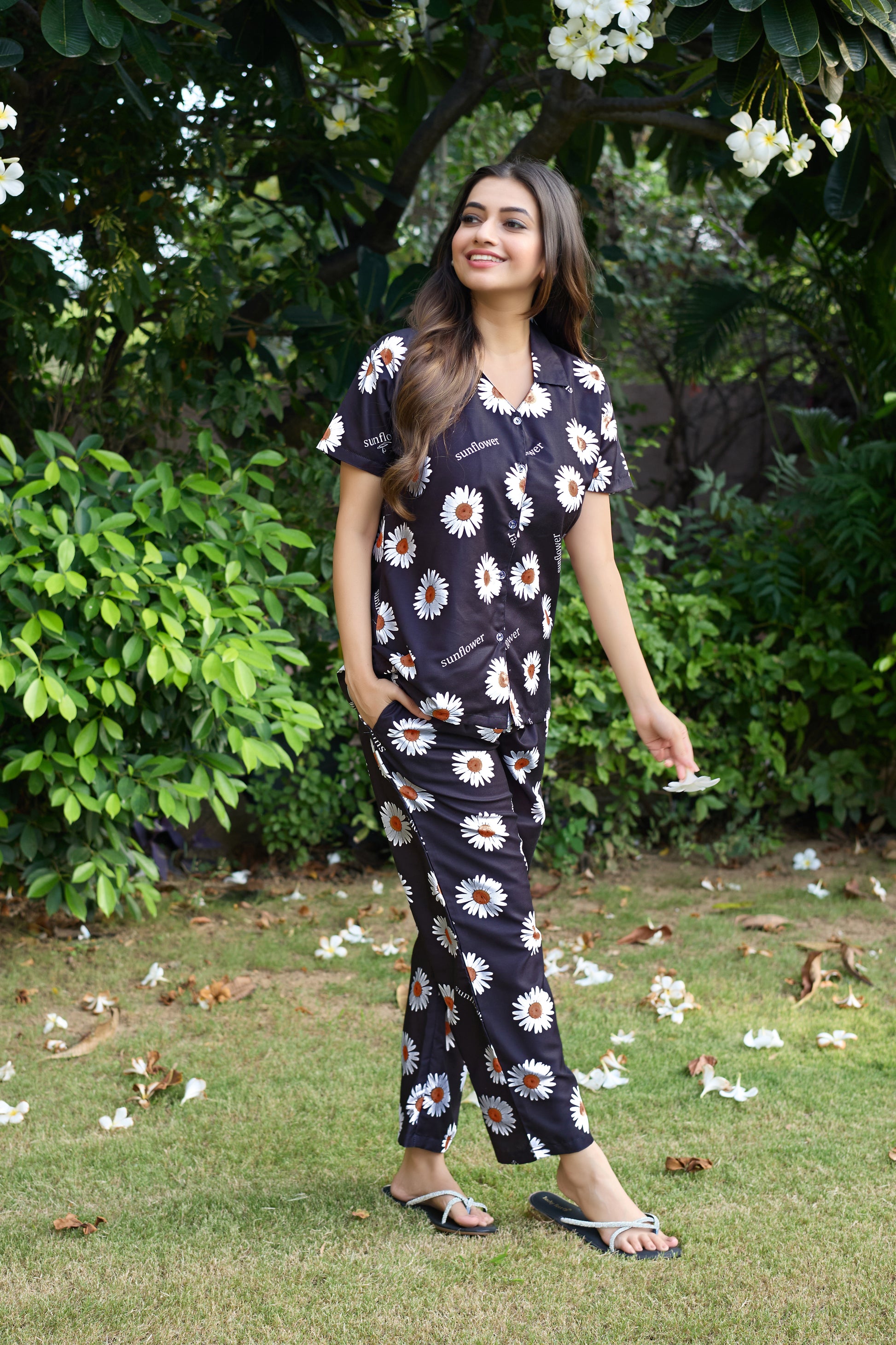 Bring a fresh floral vibe to your nights with our Black Daisy Print PJ Set 🌸. Crafted from soft, breathable fabric, this nightwear set is designed to give you unmatched comfort and effortless style. The classic black base with vibrant daisy prints adds a playful yet chic look, making it perfect for both bedtime and lounging.