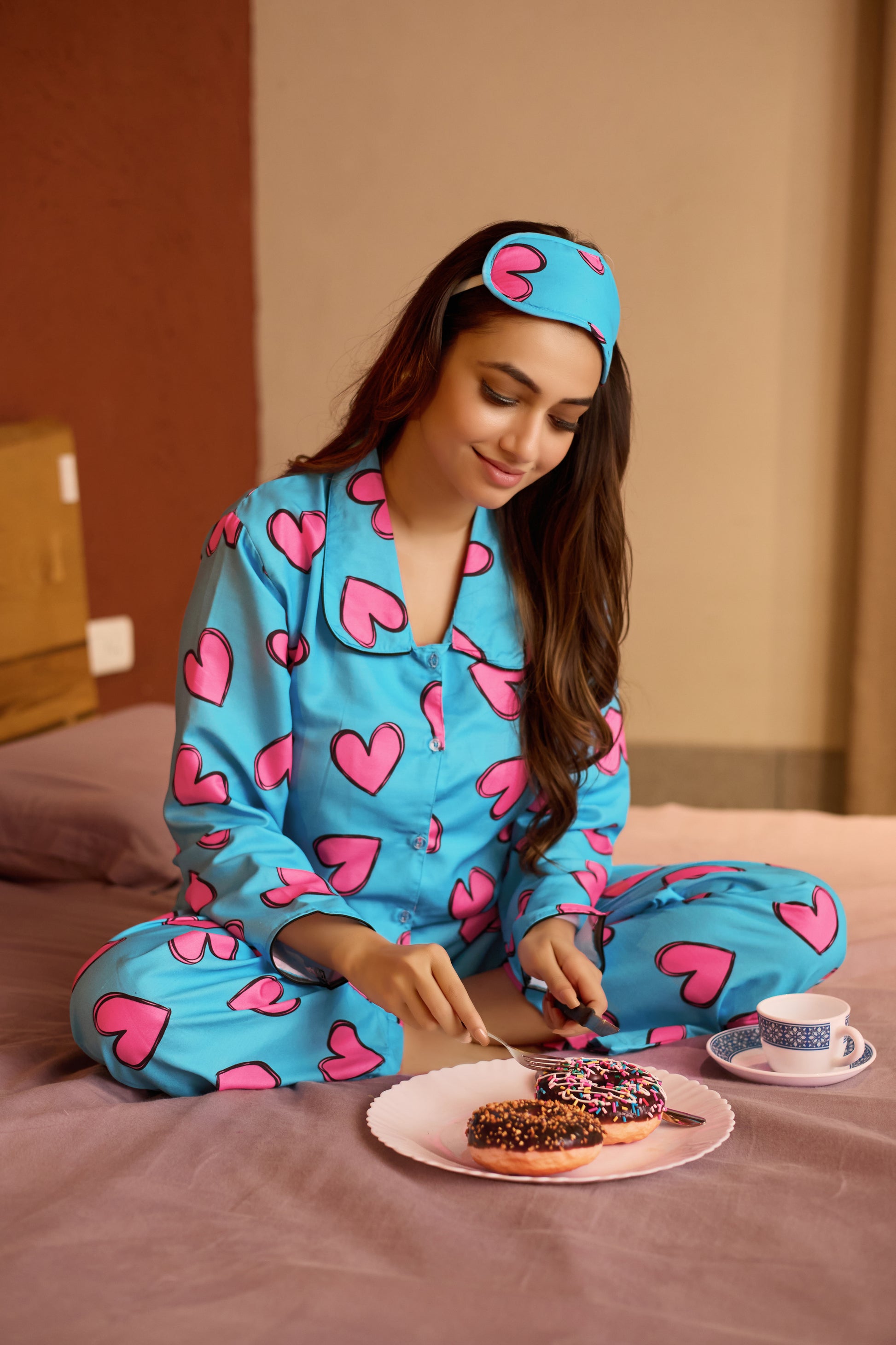 Women's Romantic Heart Print PJ Set with Head Wrap